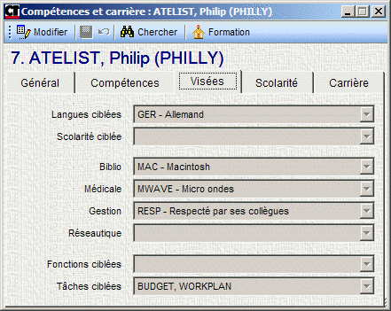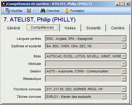 Cet onglet reprend les compétences acquises documentées dans la fiche de la personne.