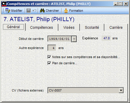 Cet onglet comprend la date de début de carrière de l'employé, le nombre d'années d'expérience pertinente et connexe, les notes sur les compétences, le plan de carrière et les fichiers externes associés à cette personne, tels que son CV. Ces fichiers sont accessibles via un menu déroulant.