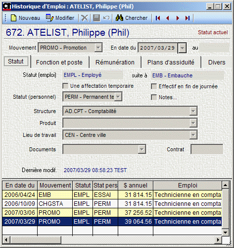 La fenêtre en bas de cet écran est surtout utilisée si vous travaillez sur un dossier de fonction (job). Elle contient l'ensemble de l'historique de l'emploi de l'employé. Cliquez sur la ligne que vous souhaitez consulter et le système affichera le fichier en question.