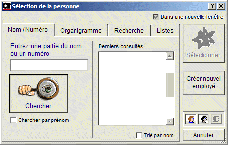 Cette boîte de dialogue permet de rechercher une personne. Elle est accessible soit automatiquement, soit via les modules Personne, Emploi, etc.