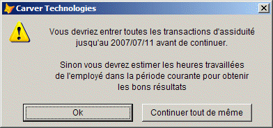 Précisez si les heures ont toutes été saisies et reportées jusqu'à la date de fermeture. Si vous sélectionnez No, une fenêtre apparaîtra vous informant que "Vous devez saisir toutes les transactions de présence jusqu'à (date de clôture)..."