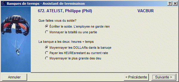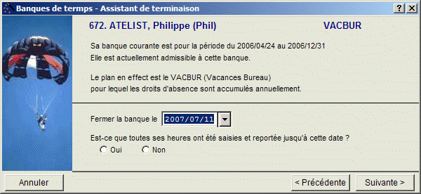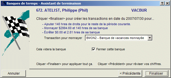 Note : Une banque ne doit pas nécessairement être fermée lors de la cessation d'emploi d'un employé. Par exemple, pour un employé "in-and-out", il peut être préférable de fermer ses banques de temps à la fin de l'année ou à une autre date.