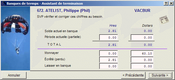 en utilisant le menu principal Tools | Wizards| Time Bank : Fermer ou Payer.