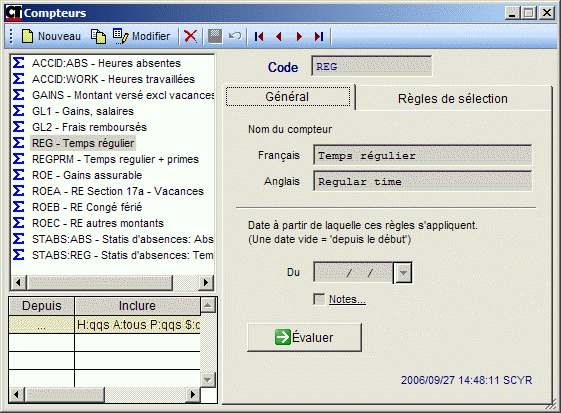 La partie inférieure gauche de l'écran présente un résumé des règles de sélection des compteurs en spécifiant la date d'entrée en vigueur et les transactions à inclure. La colonne "inclure" comprend les éléments suivants :