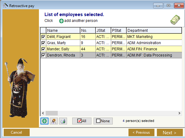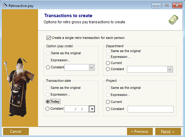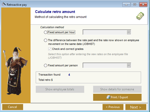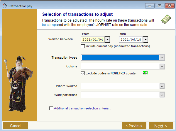 - Identification des employés sur la base de certains critères. Spécifier les [transactions à examiner] (#transaction). Spécifier la méthode de calcul du montant rétro, le nombre de transactions à créer et la manière de créer les transactions rétro.