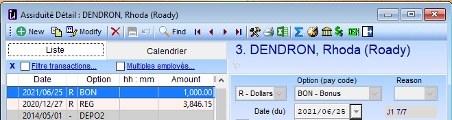 Les transactions individuelles peuvent être consultées dans l'écran Attendance Detail de l'employé.