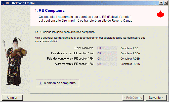 Quatre compteurs sont nécessaires pour que l'assistant puisse totaliser les montants des cases Rémunération assurable, Indemnité de congés payés, Indemnité de vacances et Autres sommes pour le relevé d'emploi.** Ces quatre compteurs doivent obligatoirement être définis à l'adresse **.