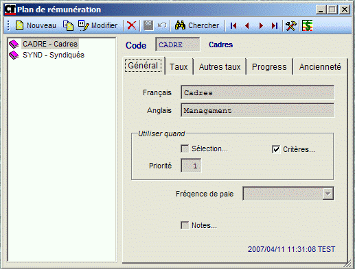Vous indiquez quel plan s'applique à quels employés dans l'onglet GENERAL de la fenêtre du plan de rémunération.